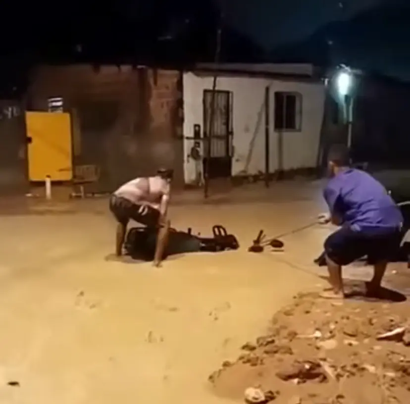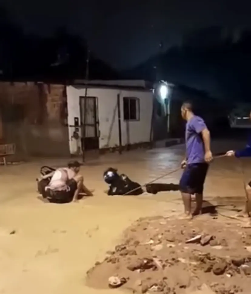 O motociclista foi surpreendido pela cratera submersa e acabou sendo arrastado pela correnteza. Imagens que circularam nas redes sociais mostram o momento em que populares utilizam uma corda para retirar o homem e a moto do local. Apesar do nível da água parecer baixo, a força da enxurrada dificultava a movimentação da vítima, que teve dificuldades para se manter na superfície.