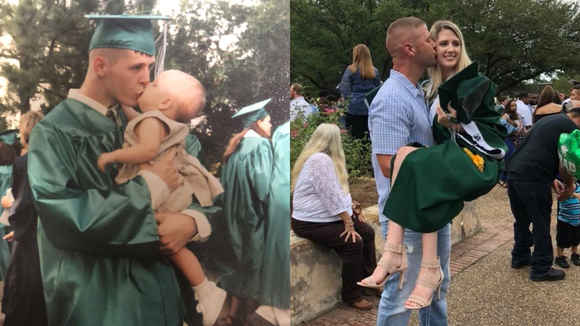 Na foto antiga, Tori aparece como um bebê no colo do pai, Dennis Roach, enquanto ele comemorava sua própria formatura na mesma escola. Dezoito anos depois, a jovem recriou a cena, agora já crescida, mas ainda no colo do pai, que a beija no rosto com carinho. “18 anos depois”, escreveu ao compartilhar as imagens no X, antigo Twitter, acompanhadas de emojis.