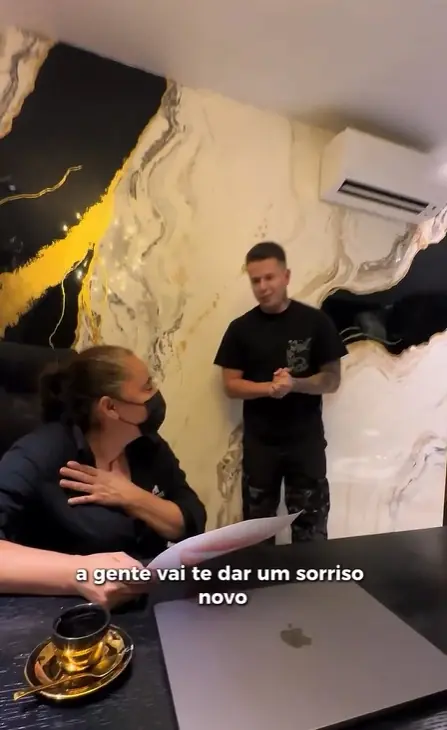 A surpresa foi planejada com carinho. A funcionária foi chamada a uma sala com a desculpa de que precisava limpar um café derramado, propositalmente. Ao entrar, foi recebida por Bruno, que interrompeu sua rotina para lhe entregar um presente simbólico: um desenho feito à mão de um sorriso, anunciando o início de uma transformação que vai além da estética, uma oportunidade de recuperar a autoestima.