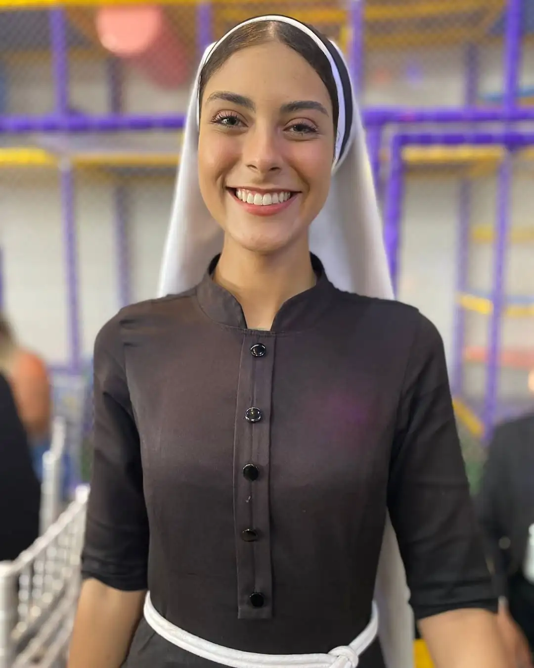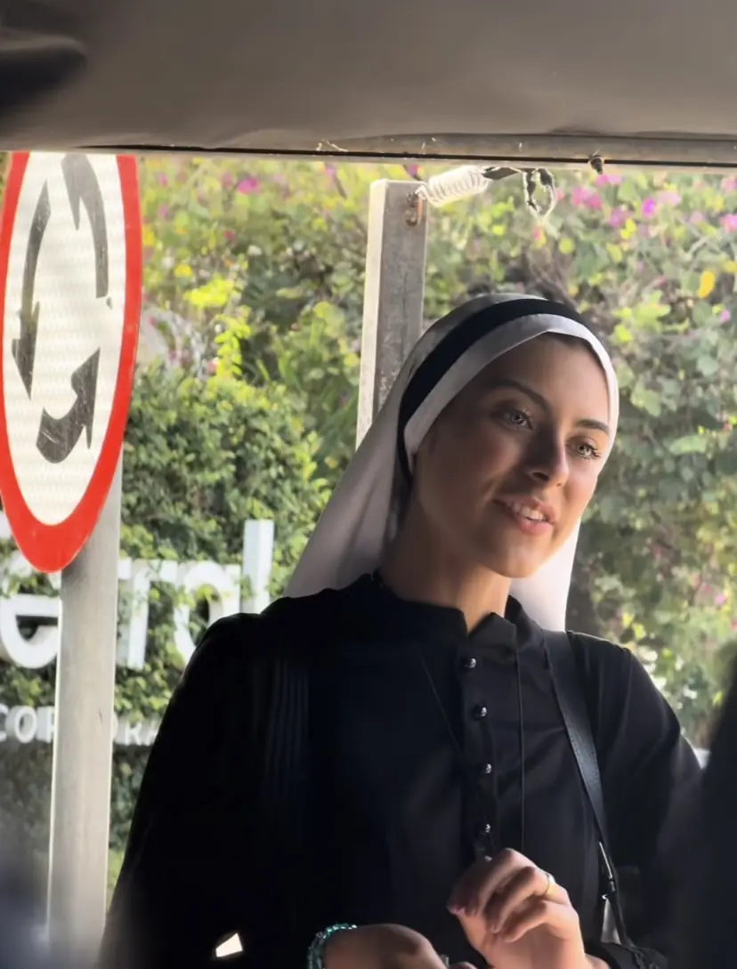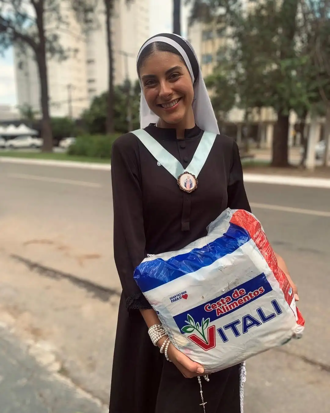 Vestida com hábito religioso e mantilha, a missionária chamou a atenção no vídeo publicado por um cliente do bar, que destacou a beleza dela e dos olhos claros. Desde os 18 anos, a jovem está na vida religiosa.