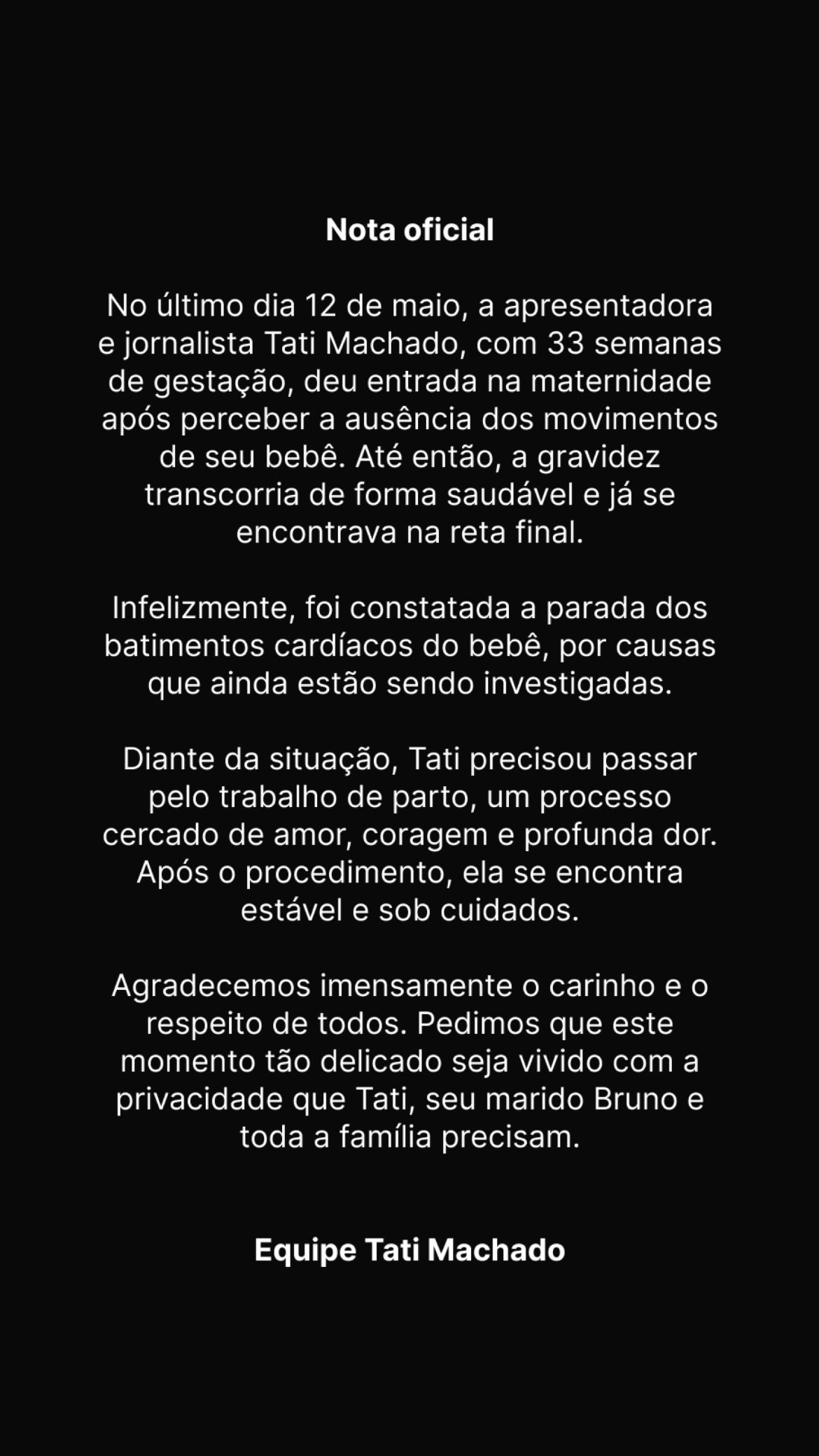Tati descreveu o episódio como um “corte seco da vida”, relatando a dificuldade de lidar com os objetos, memórias e planos que envolviam a chegada do primeiro filho do casal. “Tudo dói, tudo!”, escreveu, revelando a intensidade do luto. Na sala de parto, ao lado do marido, ela enfrentou os momentos finais da gestação com coragem, apesar da dor insuportável.
