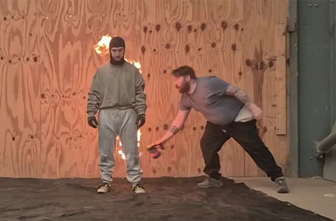 Durante a gravação, um coordenador de dublês colocou fogo em Luney, enquanto outro membro da equipe marcava o tempo com um cronômetro visível na câmera. À medida que o tempo avançava, partes das suas roupas iam se soltando e queimando no solo, mas ele manteve o ritmo e concluiu os sete mortais em menos de 30 segundos. Assim que o cronômetro zerou, o homem caiu de joelhos e, imediatamente, um dos assistentes cobriu suas costas com um tecido para abafar o fogo, enquanto outro usava um extintor para apagar completamente as chamas.