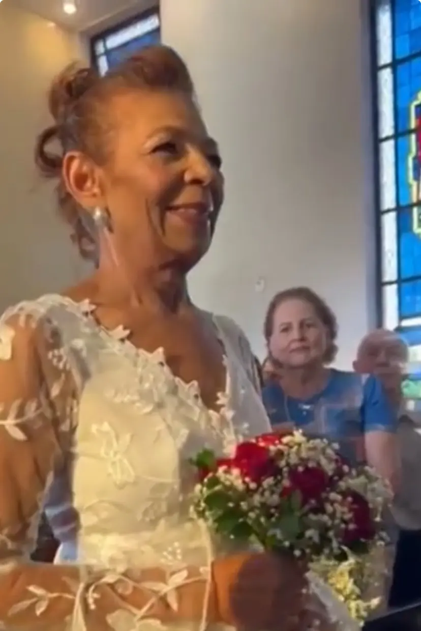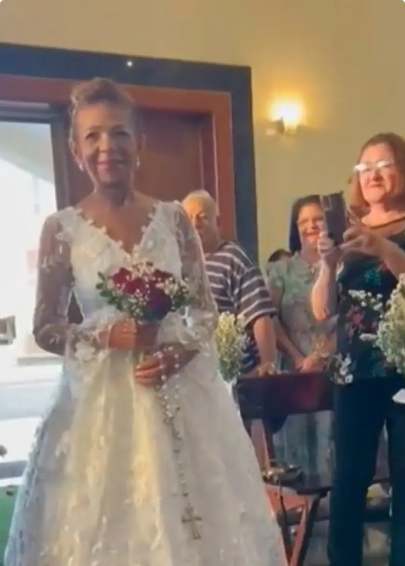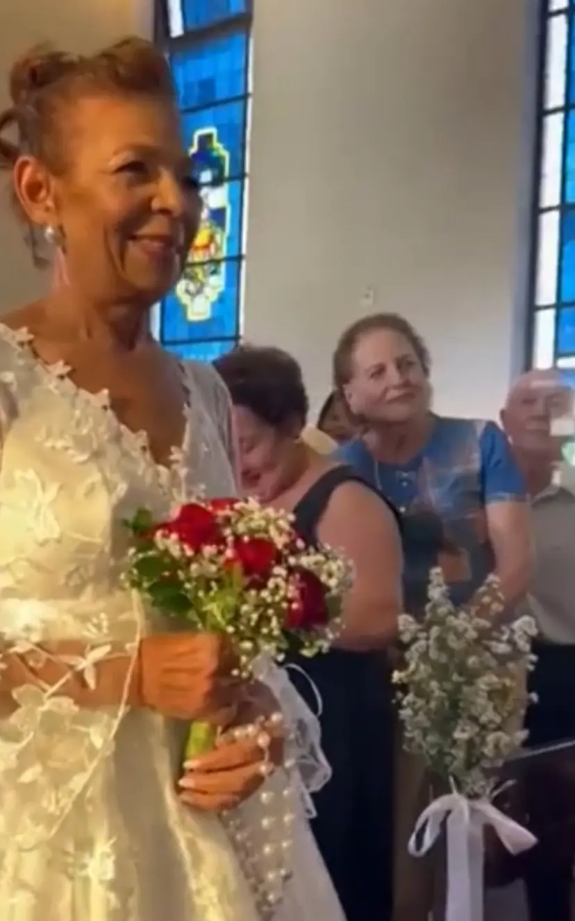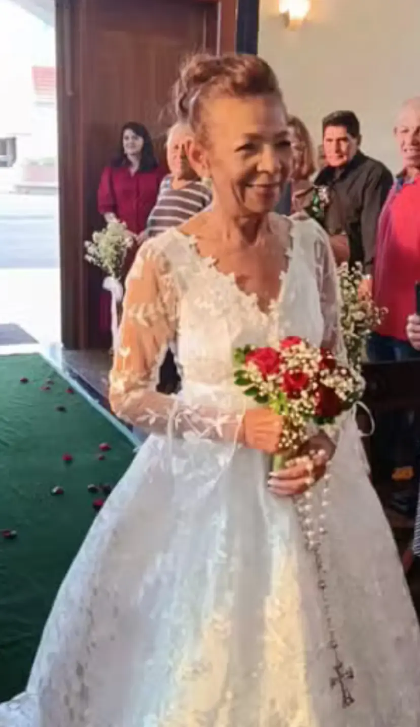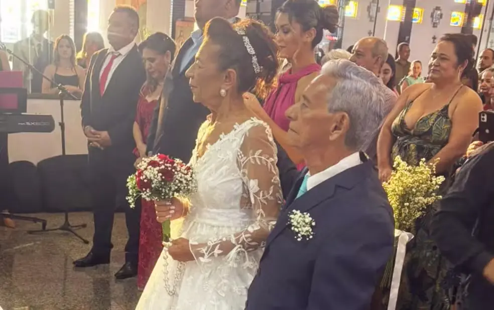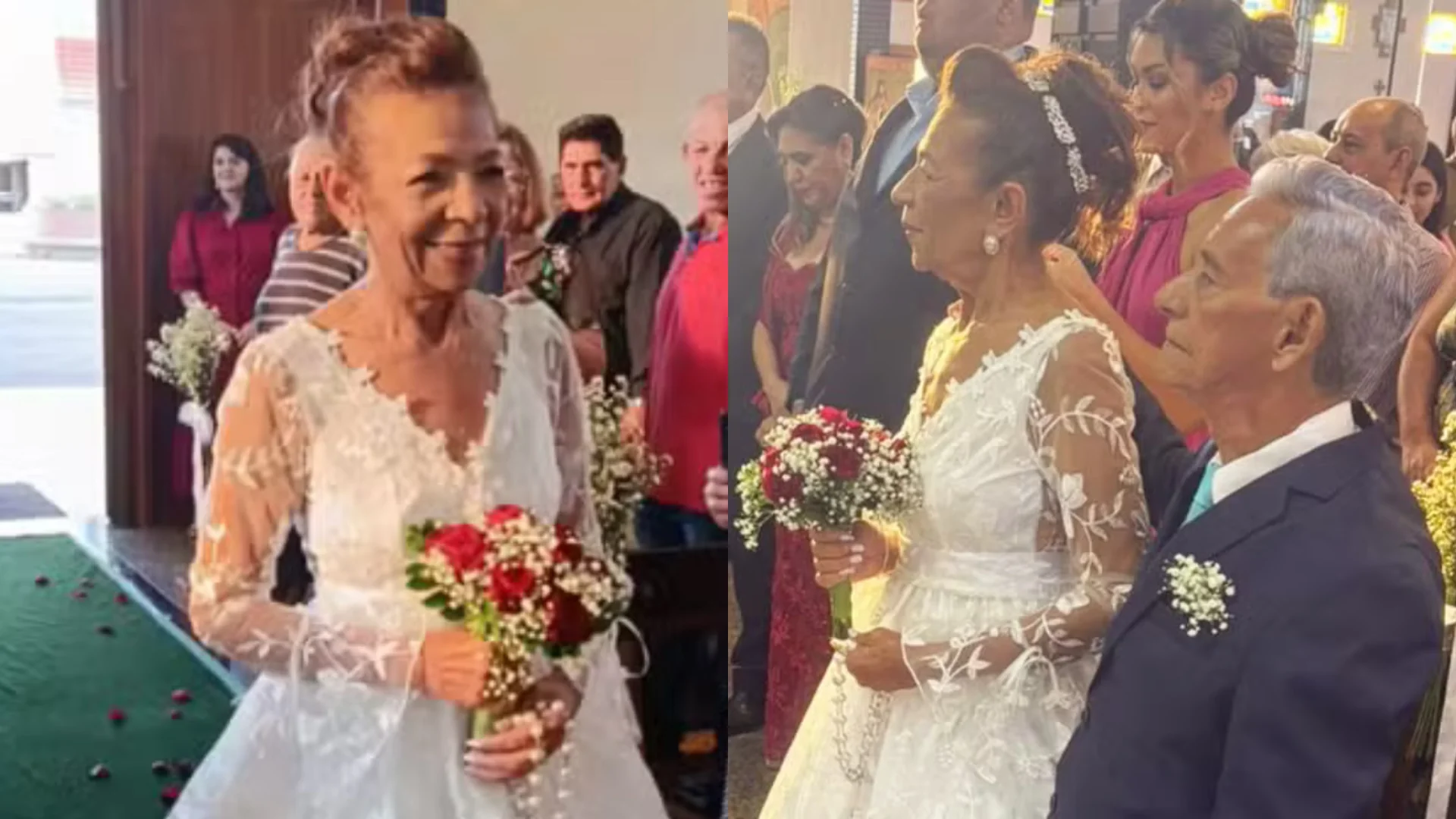 Maria Lúcia dos Santos, de 70 anos, se casou com Clemente dos Santos, de 84, em uma cerimônia na cidade de Goioerê, no Paraná. Foi a primeira vez que Maria se casou e namorou. O casal se conheceu em 2022 em um grupo da terceira idade e, desde então, passaram a conviver em atividades como dança e ginástica.