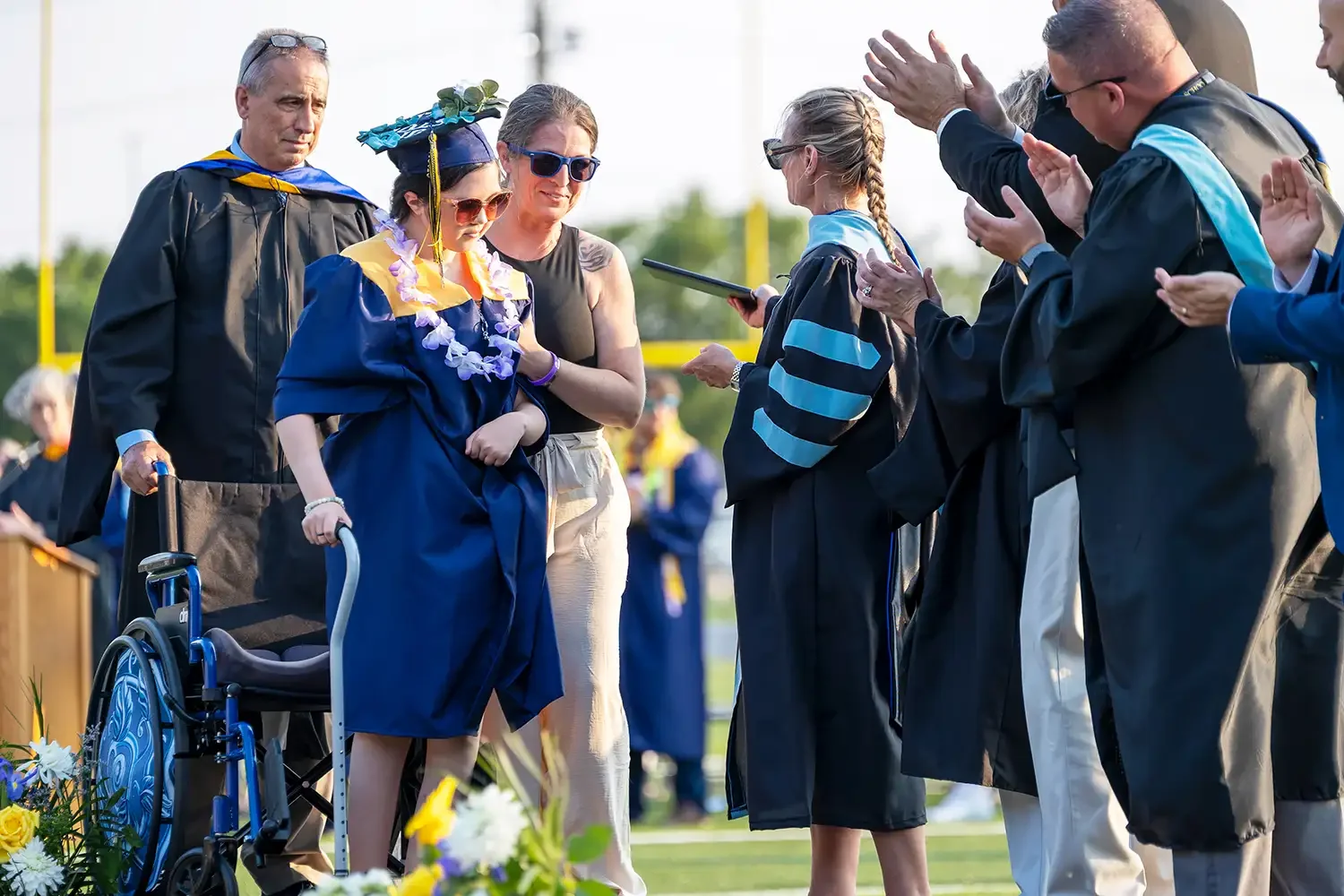 Mesmo assim, não desistiu de se formar com sua turma. Recuperou o tempo perdido com aulas de reforço, estudou em casa e frequentou a escola de verão. “Sou muito exigente comigo mesma quando preciso fazer alguma coisa”, afirmou. Em agosto do ano passado, começou fisioterapia duas vezes por semana. Seu objetivo era claro: caminhar até o centro do palco para receber o diploma.