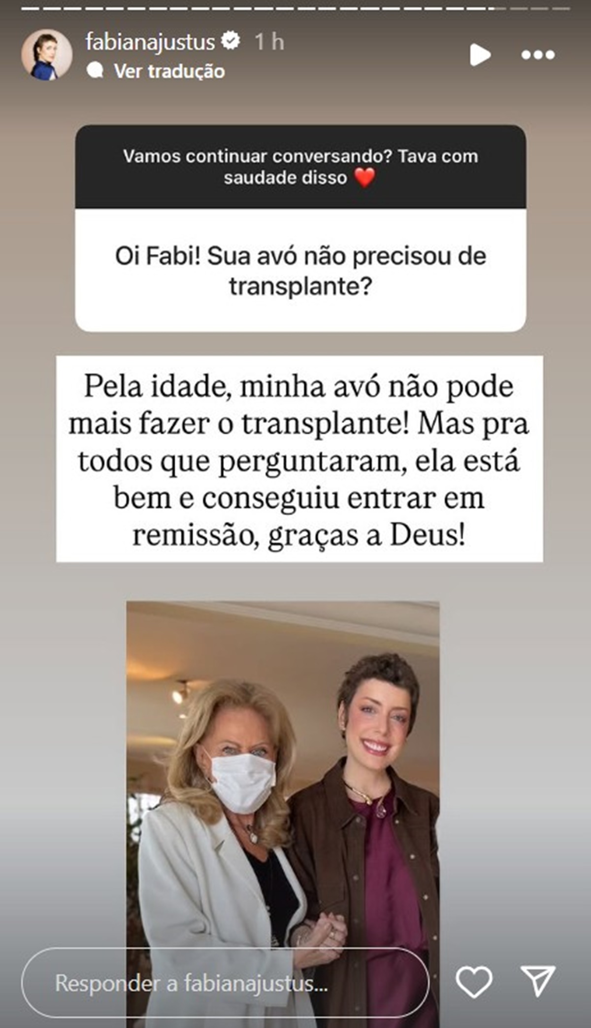 Fabiana, que também passou por um transplante de medula recentemente e chegou a se emocionar ao ter contato com seu doador, vê na recuperação da avó uma confirmação de que a fé e o amor familiar podem fazer a diferença nos momentos mais difíceis.