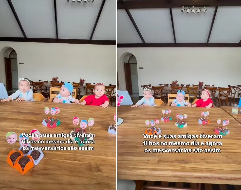 Três amigas de Niterói (RJ) viveram uma coincidência rara: os filhos de cada uma nasceram no mesmo dia, 10 de novembro de 2024. Desde então, os mêsversários são comemorados em conjunto. Ana Julia Campos deu à luz Marina; Paula Costa teve o Bernardo, e Carolina Monnerat é mãe de Maria. Todas são mães de primeira viagem.