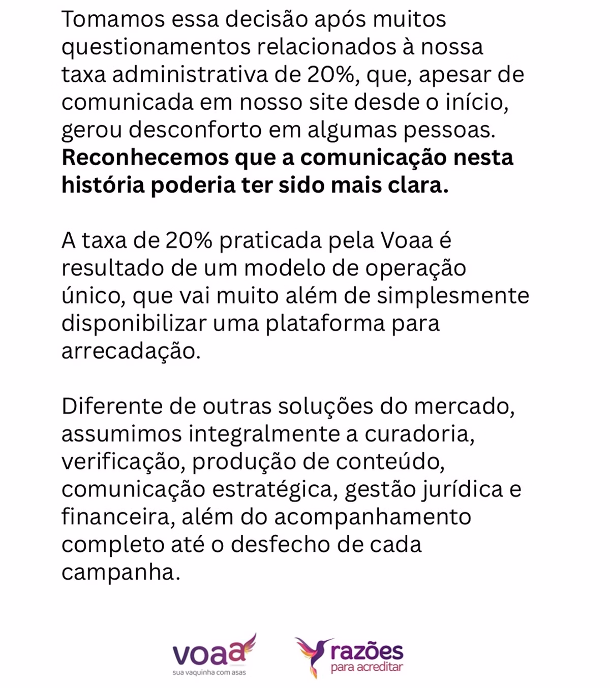 Em nota oficial, a Voaa justificou a taxa como parte de um modelo operacional que inclui curadoria, verificação, produção de conteúdo e gestão jurídica, além de alegar que a campanha havia se tornado alvo de ataques e desinformação, desviando o foco da solidariedade. Por isso, decidiram cancelar a vaquinha e devolver integralmente os valores arrecadados, automaticamente, a partir do dia 30 de junho.