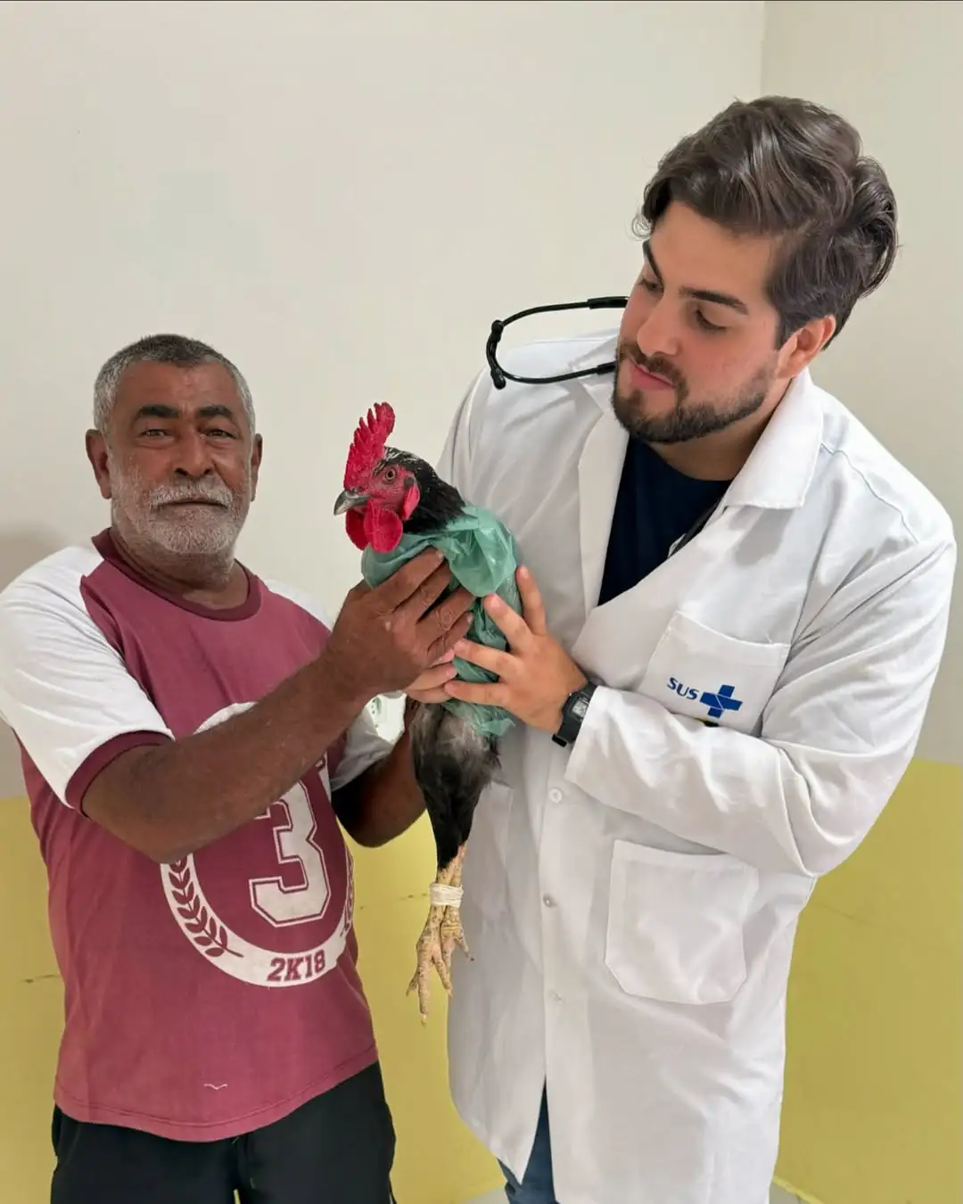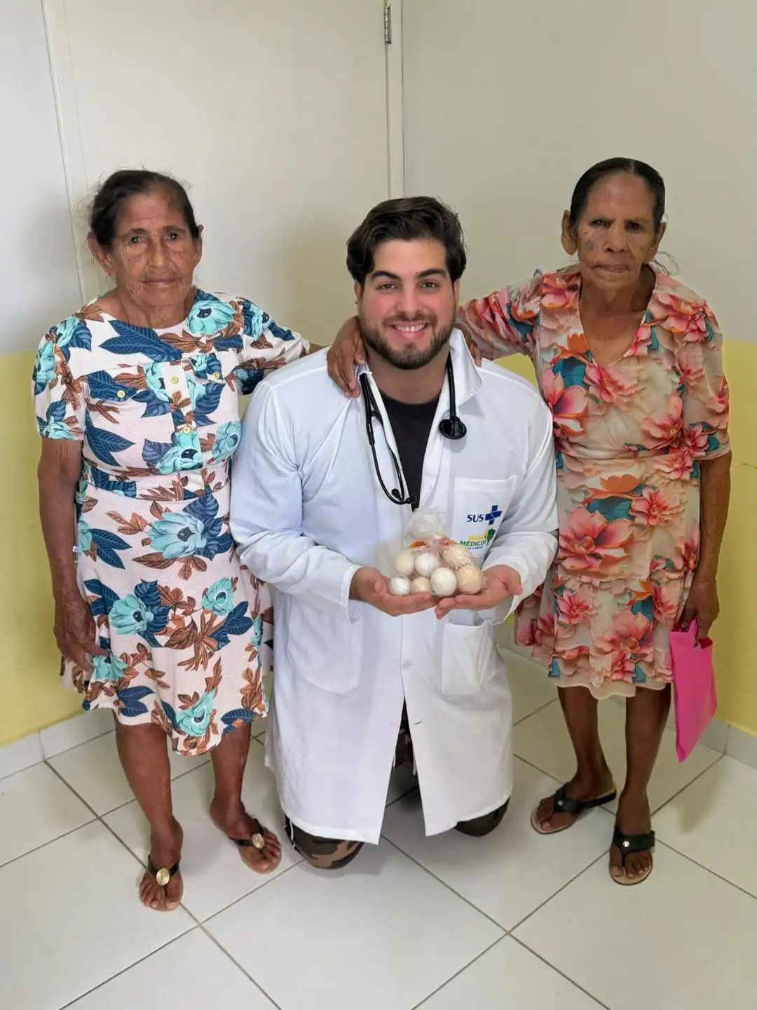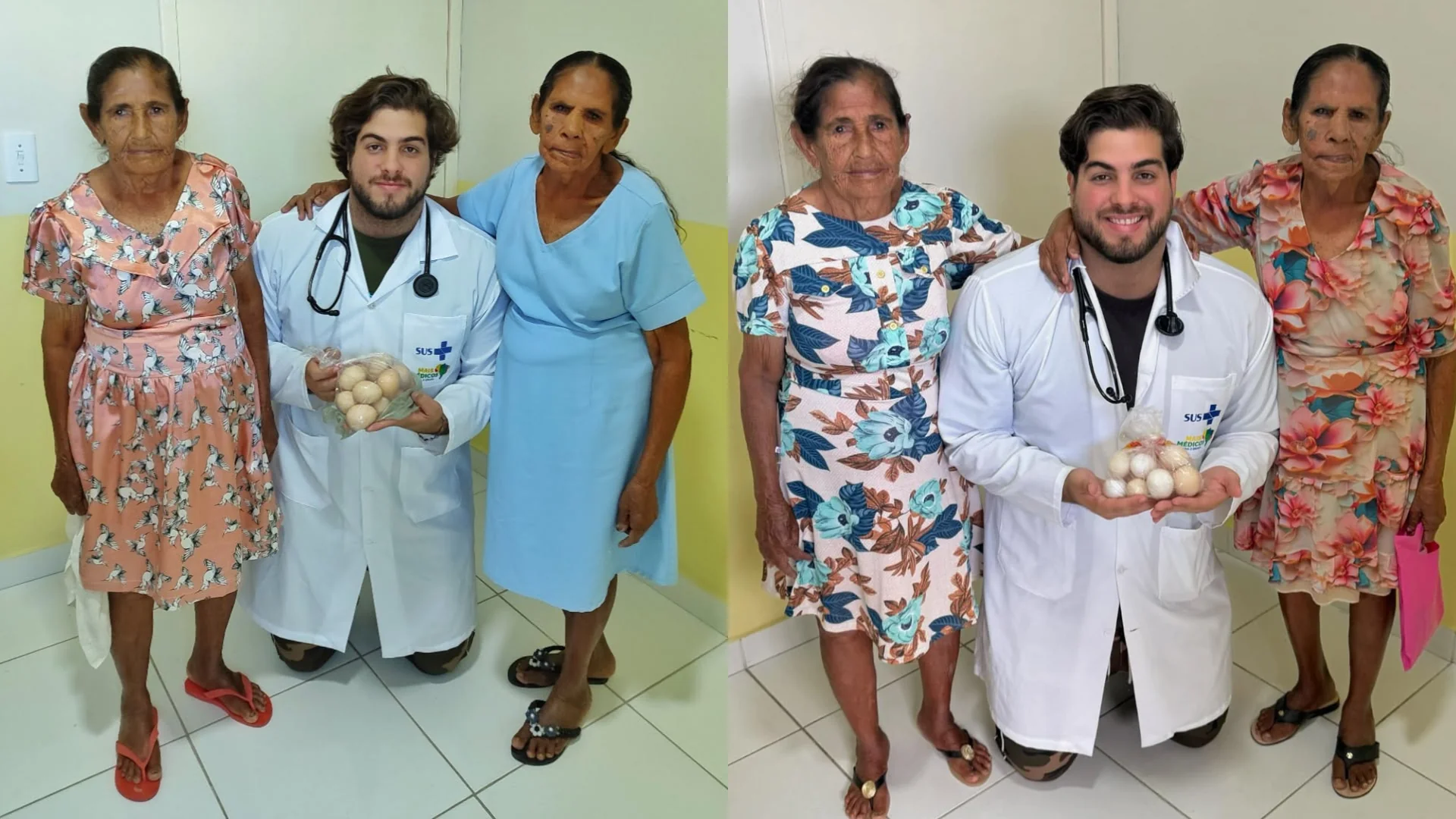 Dona Cícera e dona Antônia, moradoras da área rural e pacientes frequentes, foram até a Unidade Básica de Saúde não para uma consulta, mas para entregar o presente ao profissional. “Já ganhei vários presentes! Ovos, galinhas, milho, acerola, pinha, abóbora… isso é uma forma de agradecimento do pessoal da zona rural”, contou o médico.