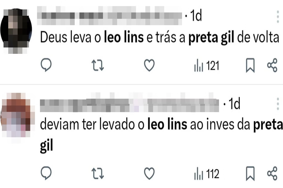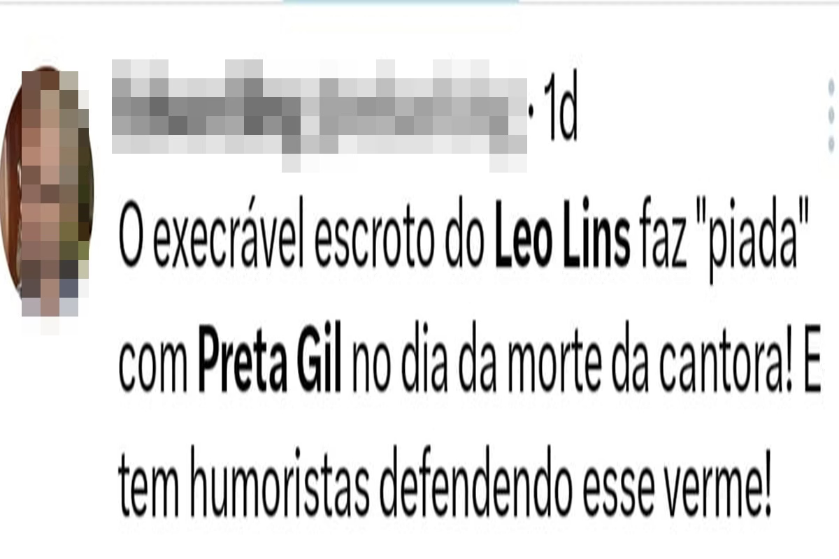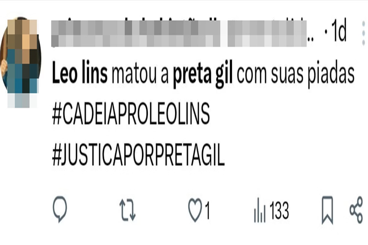 Alguns internautas chegaram a pedir a prisão do humorista, utilizando hashtags como “#cadeiaproleolins” e “#justiçaporpretagil”. Comentários como “Leo Lins matou a Preta Gil com suas piadas” e “O execrável escroto do Leo Lins faz ‘piada’ com Preta Gil no dia da morte da cantora!” ilustram a revolta do público. Houve também manifestações de desejo de que o humorista fosse punido de forma mais severa, inclusive com insinuações sobre sua morte, evidenciando o quão controversa foi sua fala.