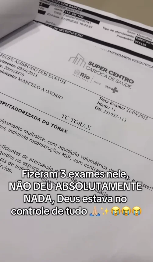 Para ela, a sobrevivência do filho foi um milagre. “Fizeram três exames nele, não deu absolutamente nada. Deus estava no controle de tudo”, celebrou a mãe nas redes sociais.