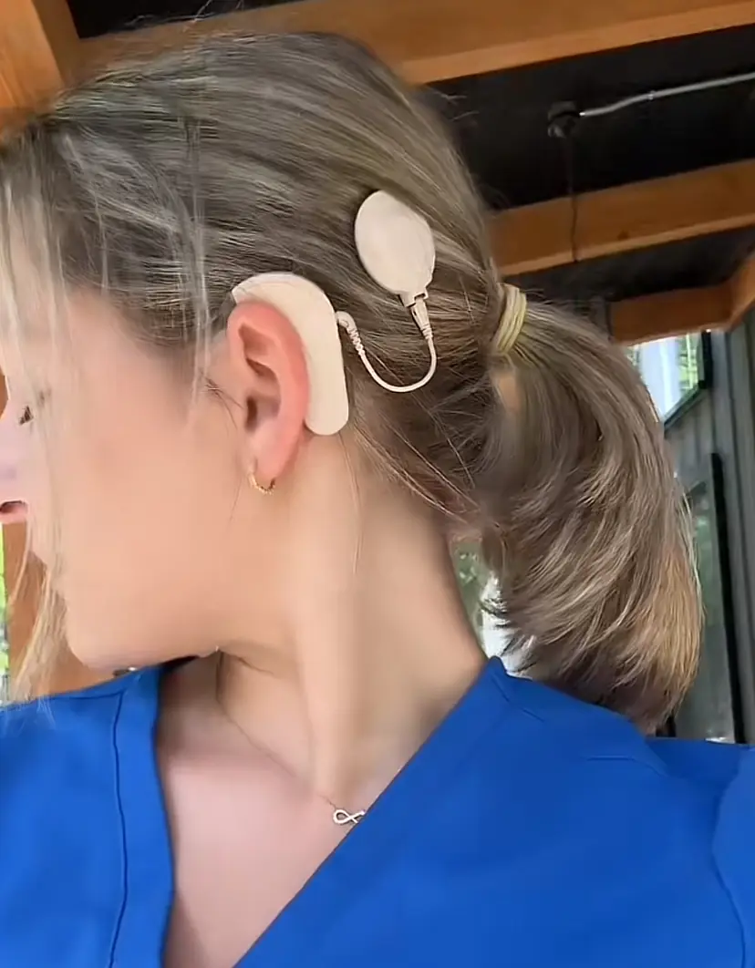 A solução encontrada foi o implante coclear. Após a cirurgia e quatro semanas de recuperação, chegou o chamado “dia da ativação”. “Eles ligaram o aparelho e, no começo, era só um zumbido. De repente, comecei a ouvir vozes, conseguia ouvir meus pais falando atrás de mim e entendia o que diziam. O implante soa como um esquilo ou um robô, mas abafado. Ainda assim, foi incrível, porque fisicamente não tenho audição nesse ouvido, mas quando coloco o aparelho, tenho. Isso é muito legal”, relatou.