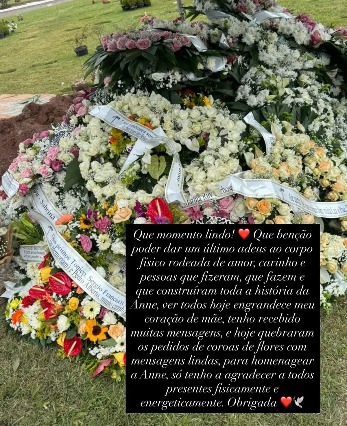 No encerramento do texto, ela homenageou a filha: “A Anne veio para transformar nossas vidas, e continua transformando. Mesmo após a sua partida, ela segue brilhando como uma força serena e calma. Tenho uma imensa gratidão no meu coração.”