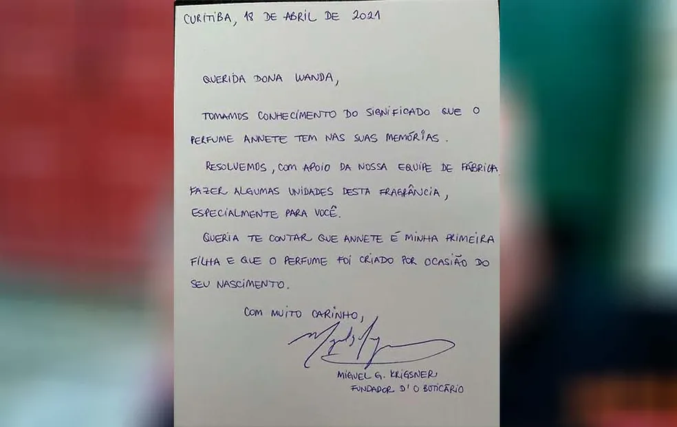 A surpresa veio quando a fábrica respondeu, não apenas disposta a produzir o perfume, mas oferecendo o presente como um gesto de carinho. “Quando me responderam dizendo que iriam fazer, mas que seria especial para ela, eu fiquei sem entender. Na hora percebi o quanto a empresa não estava preocupada só com o dinheiro e sim com a memória afetiva que aquele perfume carregava”, afirmou Karyne. A homenagem foi revelada no aniversário de 78 anos de Wanda. A marca não só enviou o perfume desejado, mas personalizou a caixa e até a etiqueta.
