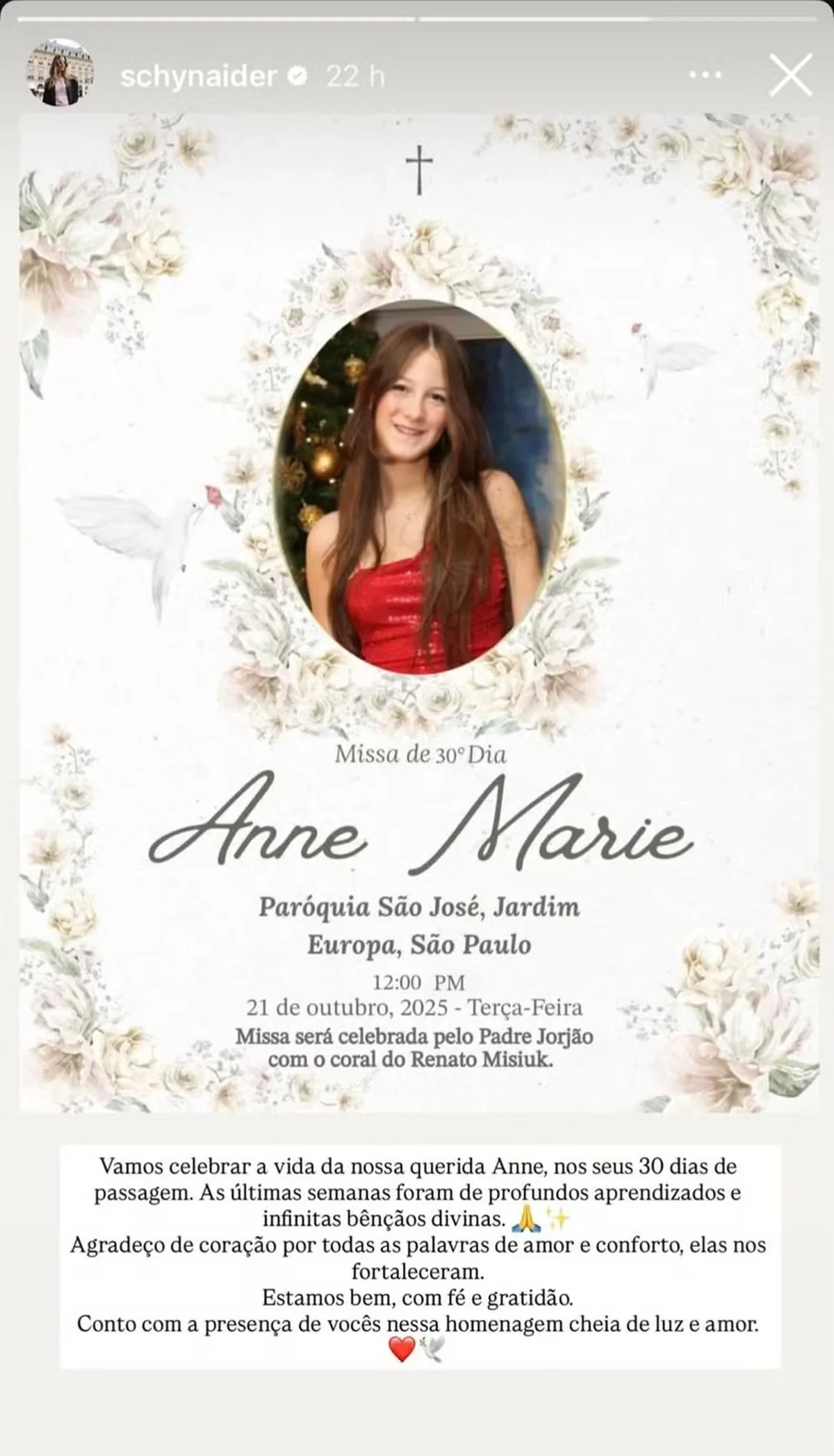 Um mês após a morte de sua filha Anne Marie, de apenas 16 anos, a modelo Schynaider Moura reuniu amigos e familiares para uma missa em memória da jovem. A cerimônia foi realizada na Paróquia São José, localizada no Jardim Europa, em São Paulo. Em suas redes sociais, Schynaider compartilhou detalhes da celebração e agradeceu pelas mensagens de apoio que tem recebido desde a perda.