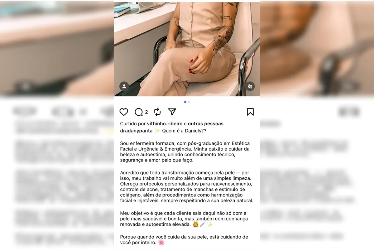 No entanto, a fiscalização constatou que Daniely ainda está cursando o oitavo semestre da graduação em enfermagem, o que a impede legalmente de exercer a profissão. Apesar disso, ela oferecia serviços como aplicação de injetáveis, harmonização facial e tratamentos com colágeno.