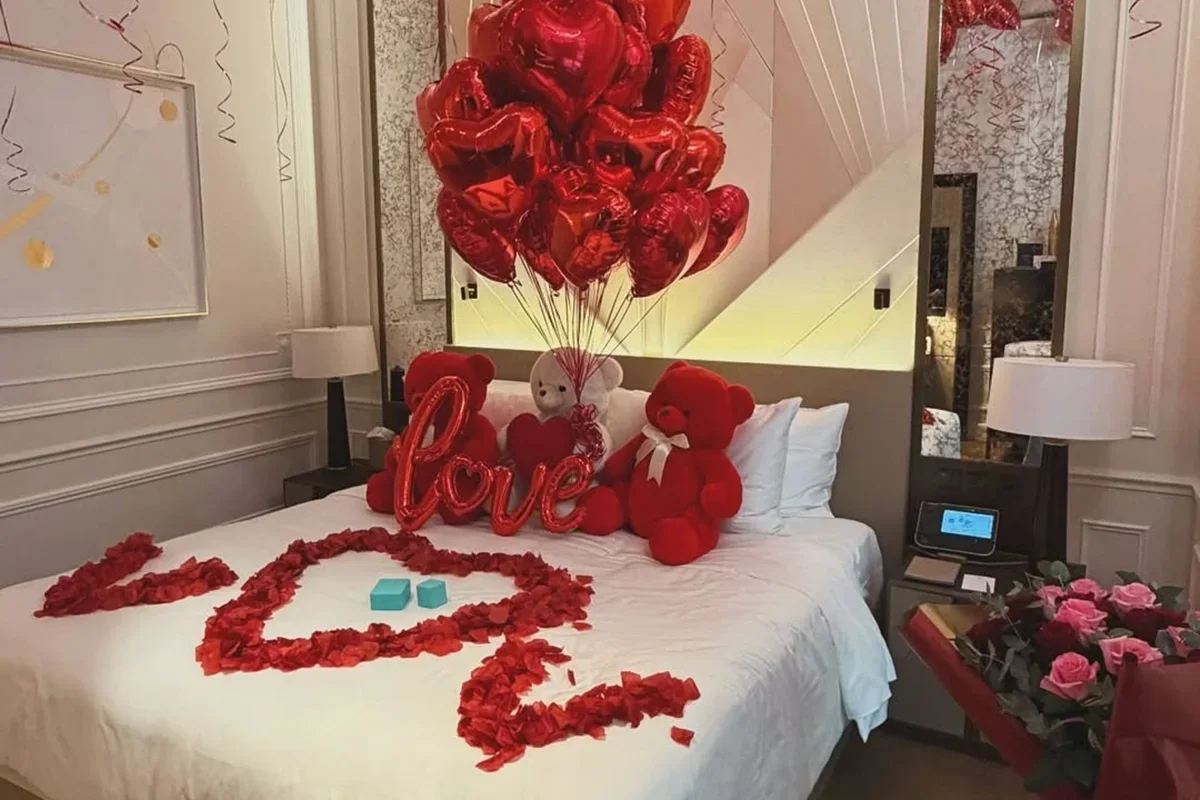 Para tornar o momento ainda mais especial, o jogador de futebol preparou uma surpresa romântica. Ele decorou a cama com balões vermelhos, ursinhos de pelúcia e formou um coração com pétalas de rosas. No centro da composição, uma caixa com presentes foi deixada para Virginia.