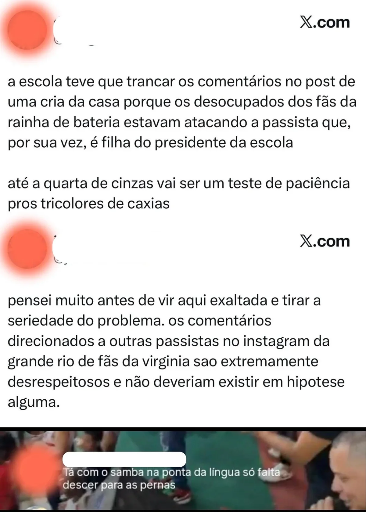 Outro membro da agremiação também se manifestou, dizendo que pensou muito antes de comentar para não desviar o foco do problema. Ele criticou veementemente os ataques direcionados às passistas e afirmou que esse tipo de comportamento não deveria ser tolerado de forma alguma.