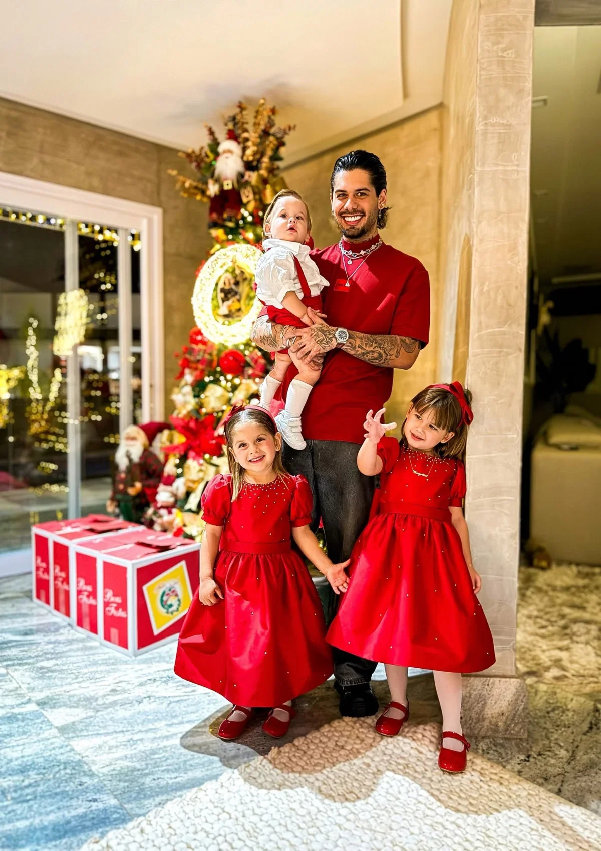 A programação da noite contou com uma missa celebrada pelo padre Marcos Rogério, figura presente em diversas ocasiões da família, além de um animado bingo que empolgou Ana Castela. Para entreter as crianças, houve uma peça teatral sobre o Natal e a tradicional chegada do Papai Noel. Na área externa, brinquedos infláveis garantiram a diversão dos pequenos, incluindo os filhos de Zé Felipe.