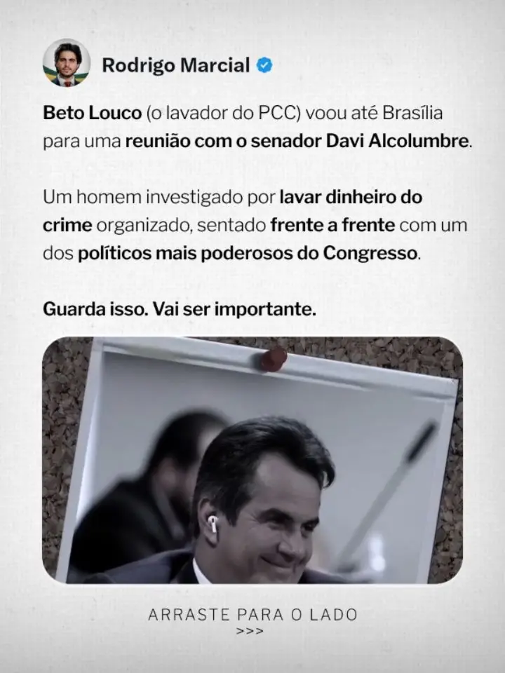 A análise de Marcial conecta ainda desvios de R$ 400 milhões da previdência de servidores no Amapá, estado de Alcolumbre, destinados ao Banco Master. O vereador pontua que o responsável pela autorização, Jocildo Silva Lemos, foi tesoureiro de campanha do senador e indicado por ele ao cargo. “O mesmo que desviou R$ 400 milhões para o Master, foi indicado por quem hoje quer barrar a investigação”, disparou.