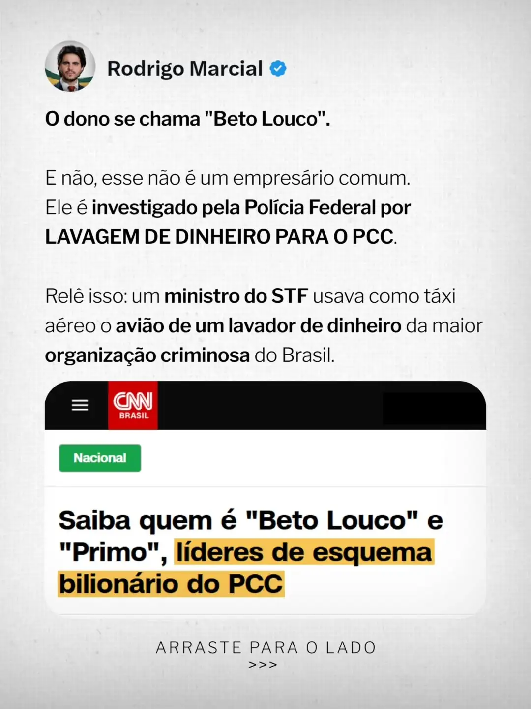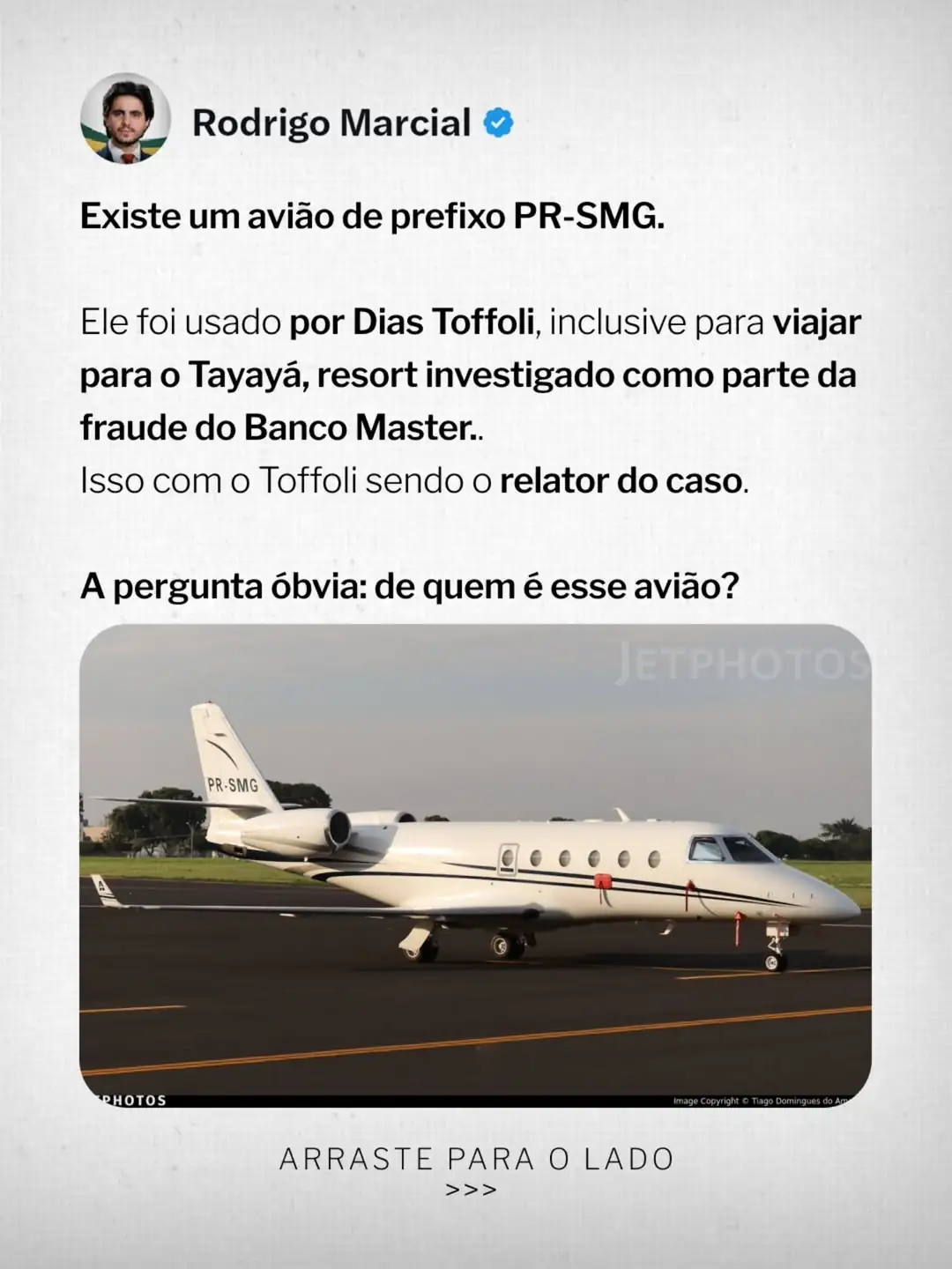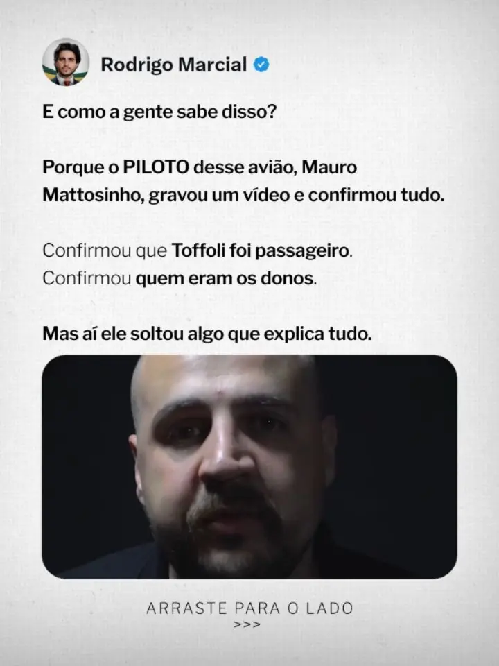No centro da denúncia, Marcial destaca o uso de um táxi aéreo pelo ministro Dias Toffoli. O proprietário da aeronave, identificado como “Beto Louco”, é investigado pela Polícia Federal por lavagem de dinheiro para o PCC. Segundo o vereador, a confirmação veio do piloto Mauro Mattosinho, que gravou um vídeo atestando que Toffoli foi passageiro. “Um ministro do STF usava como táxi aéreo o avião de um lavador de dinheiro da maior organização criminosa do Brasil”, ressaltou Marcial, acrescentando que o dono da aeronave teria se reunido em Brasília com Davi Alcolumbre.