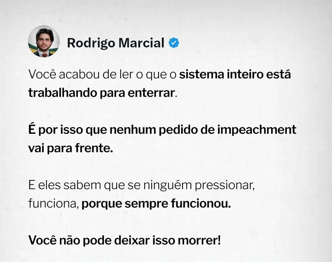 A peça final da tese apresentada pelo vereador envolve o pagamento de R$ 129 milhões por parte do Banco Master à esposa do ministro Alexandre de Moraes. Para Rodrigo Marcial, essa sequência de fatos explica uma possível blindagem institucional e a paralisia de pedidos de impeachment no Congresso. “É por isso que nenhum pedido de impeachment vai para frente. E eles sabem que se ninguém pressionar, funciona, porque sempre funcionou”, concluiu o vereador.