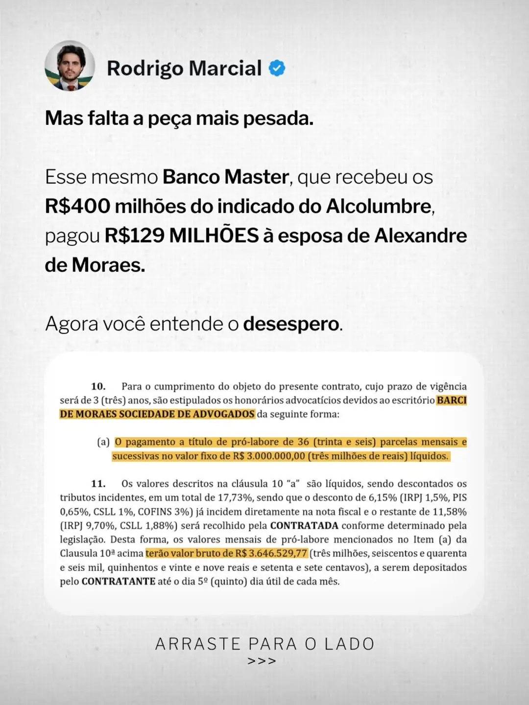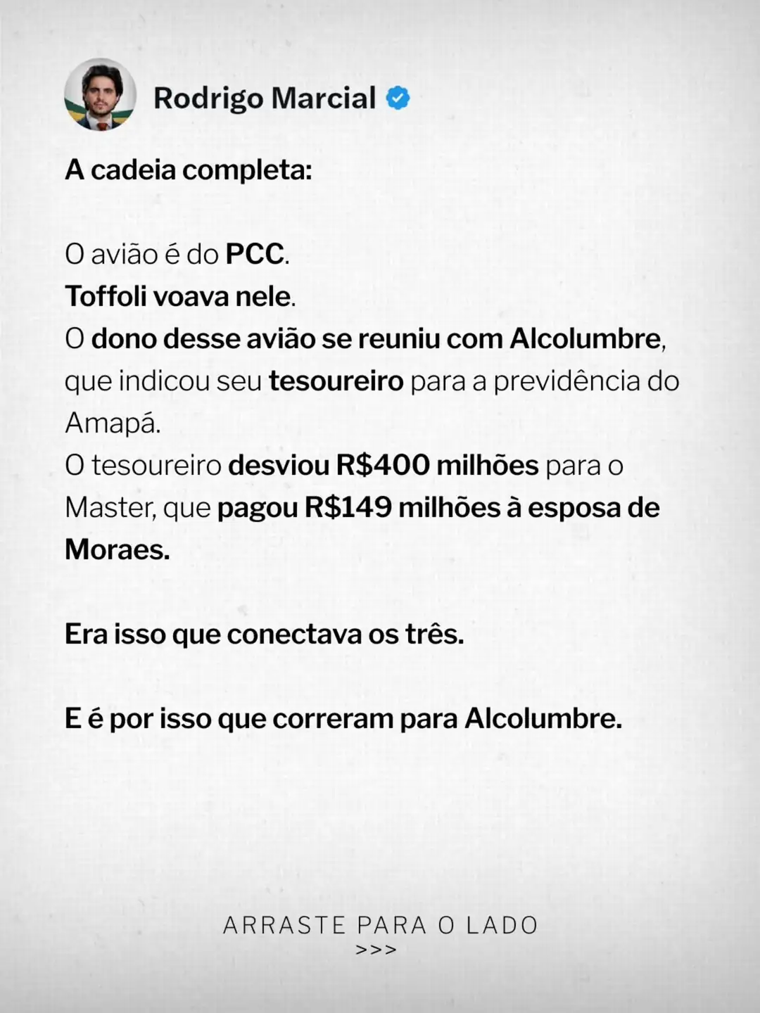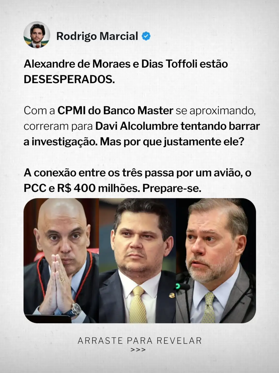 O vereador de Curitiba e advogado Rodrigo Marcial publicou uma análise detalhada sobre o que classifica como um esquema de conexões entre membros do Supremo Tribunal Federal (STF), o senador Davi Alcolumbre e o Banco Master. Segundo Marcial, a aproximação da CPMI do Banco Master teria provocado uma reação coordenada de Alexandre de Moraes e Dias Toffoli junto ao senador para tentar barrar as investigações.