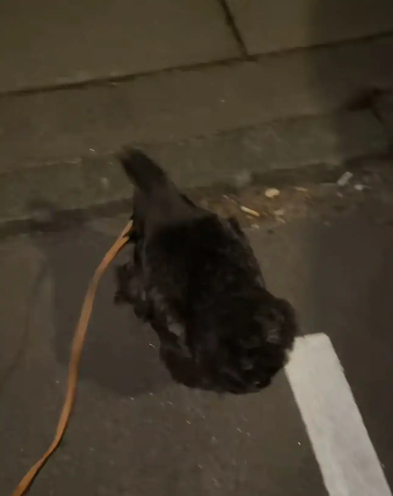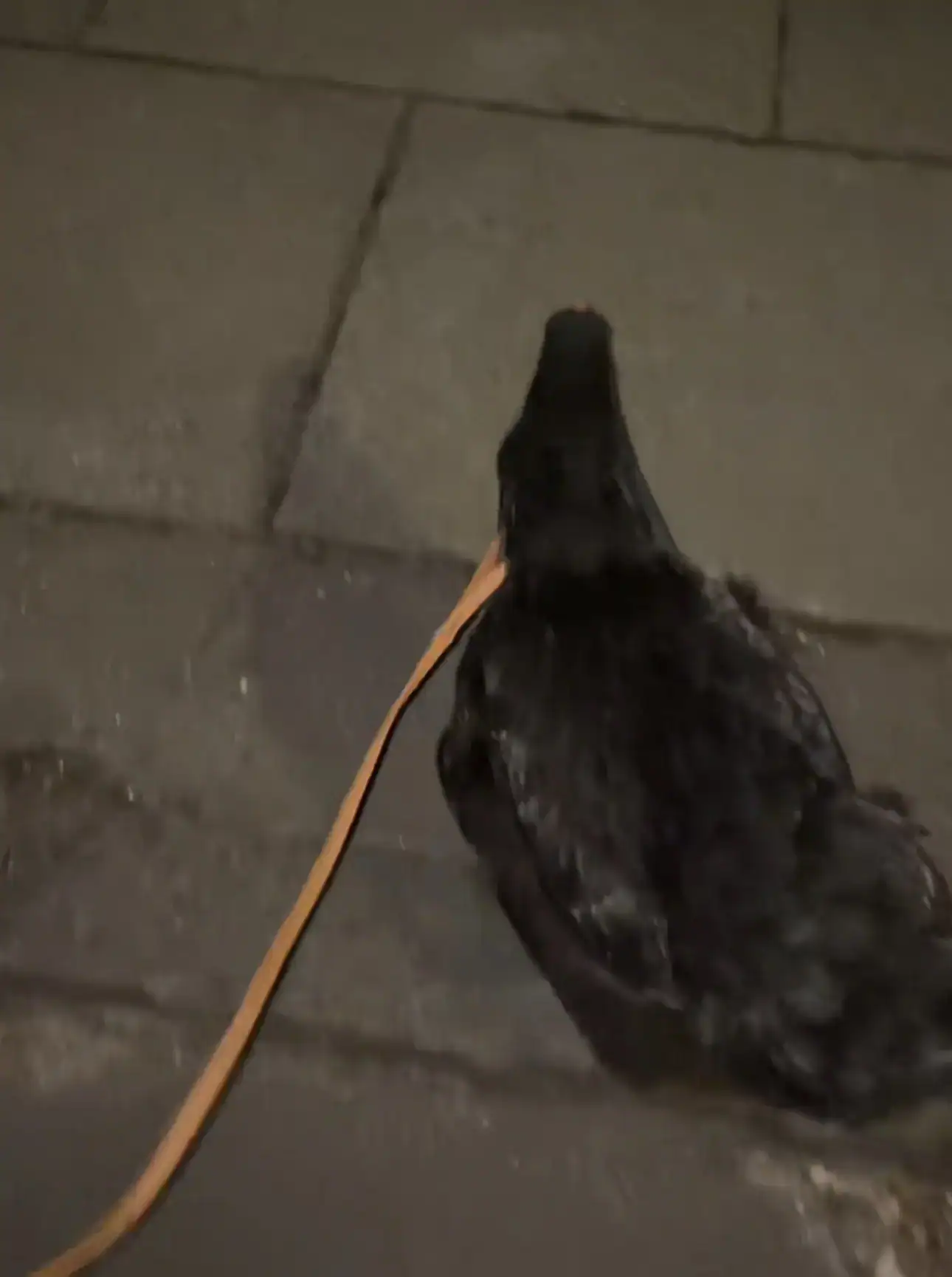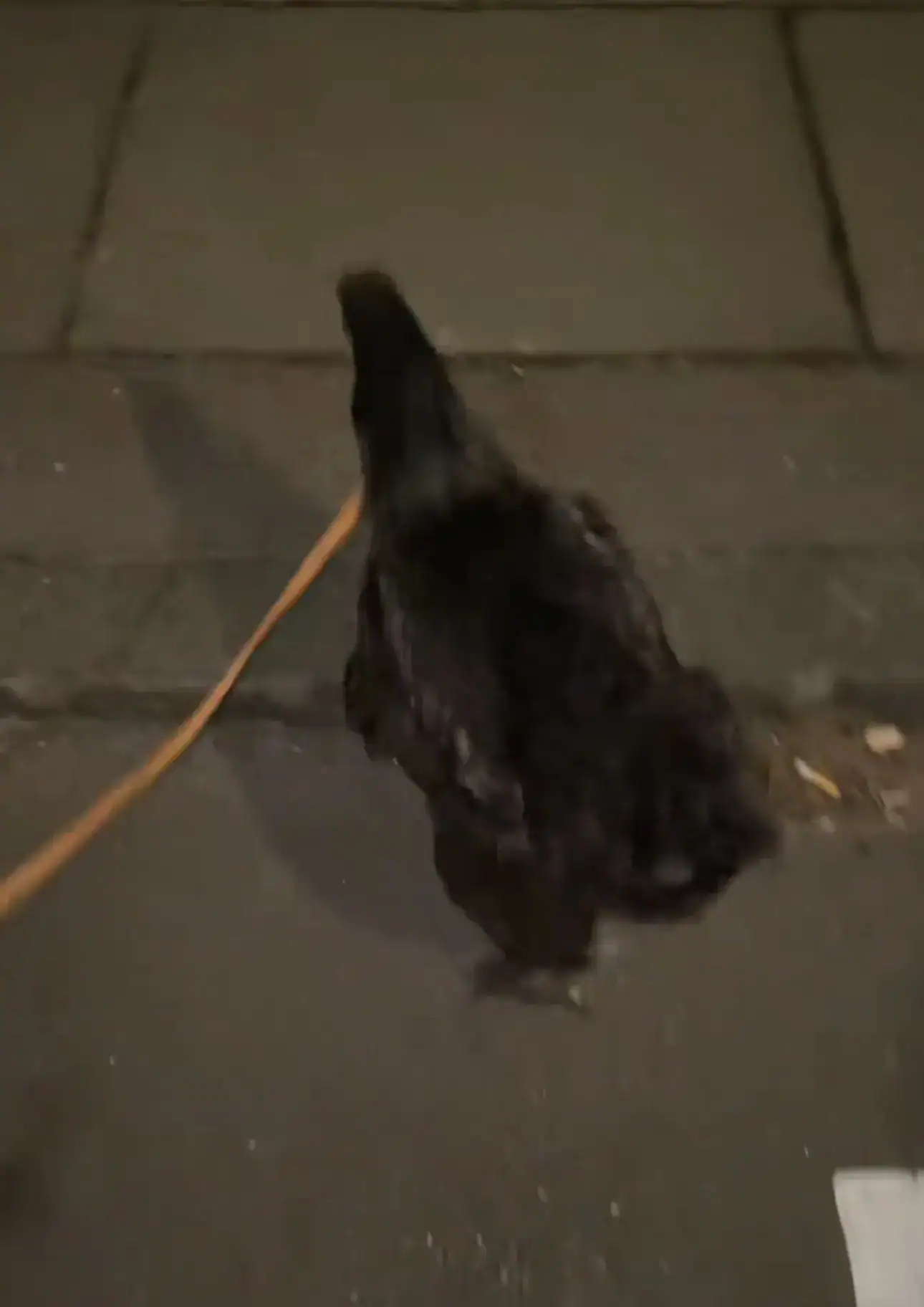 Mulher sai para caminhar à noite com uma galinha na coleira para se proteger